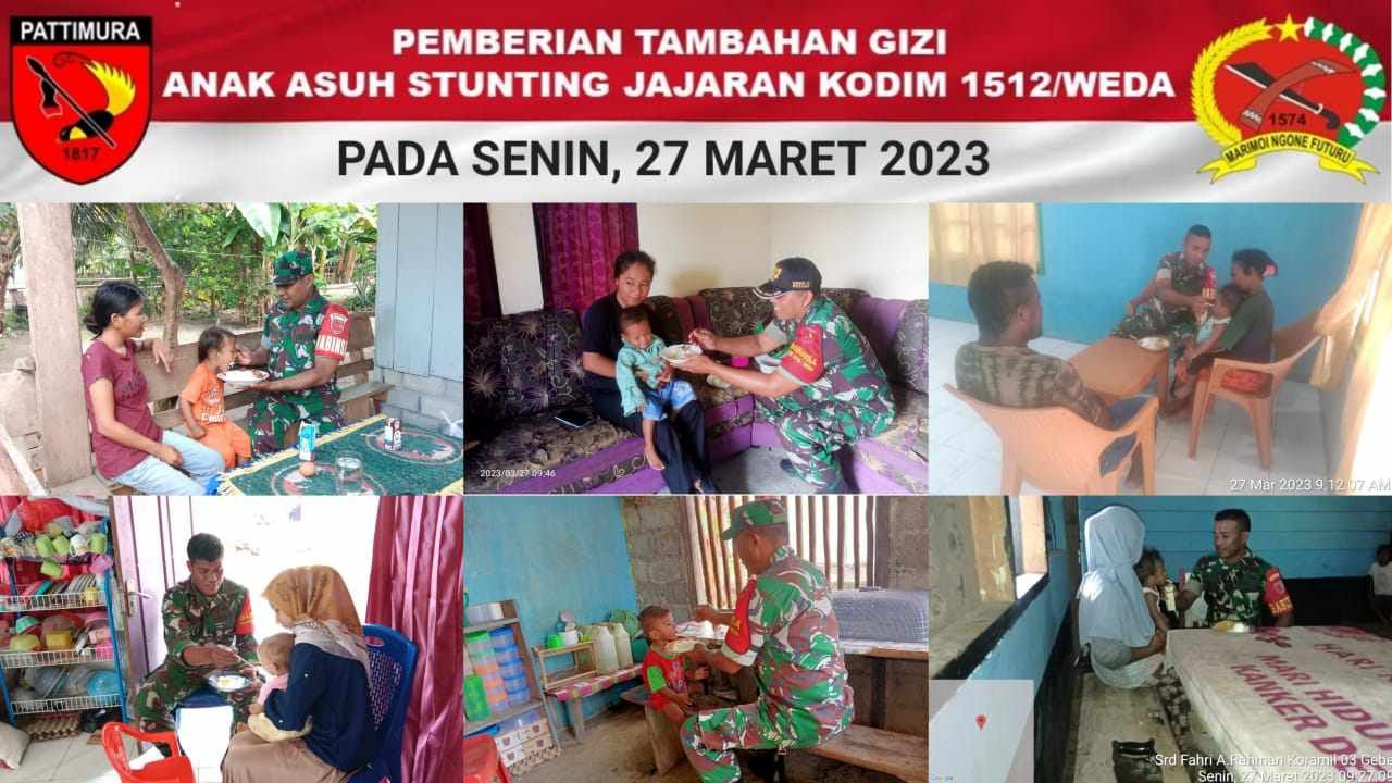 Atas dasar itu, sambung Dandim, seluruh jajaran TNI AD di jajaran kodim 1512/Weda melalui seluruh babinsa terus berupaya melakukan intervensi terhadap stunting dengan menggulirkan berbagai gebrakan program. (Pemberian nasi satu piring) perhari untuk anak penderita stunting.