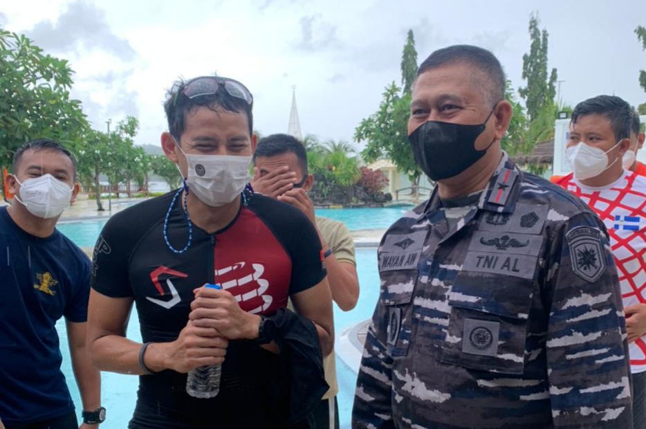 NASIONALXPOS.CO.ID, MINUT– Komandan Pangkalan Utama TNI AL (Danlantamal) VIII Brigadir Jenderal TNI (Mar) I Wayan Ariwijaya, S.E., CFrA., mendampingi Menteri Pariwisata dan Ekonomi Kreatif (Menparekraf) Sandiaga Uno saat melakukan kunjungan ke Likupang, Minahasa Utara (Minut), Sabtu (6/3/2021).