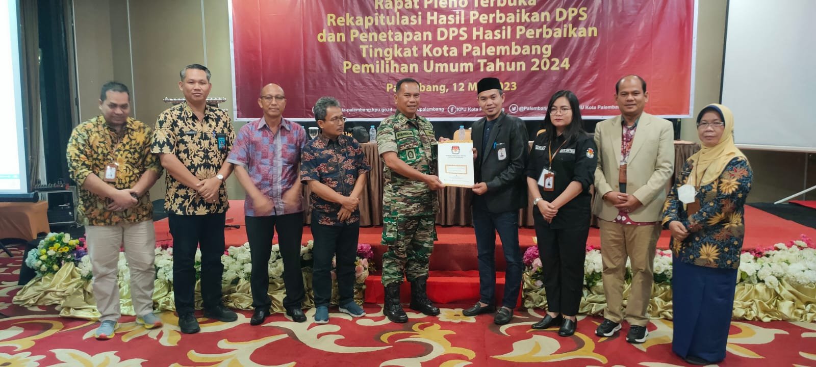 NASIONALXPOS.CO.ID, PALEMBANG – Dandim 0418/Palembang Letkol Czi Arief Hidayat M.Han, diwakili Danramil 06/Kamboja Kapten Inf Syafrullah, menghadiri kegiatan Rapat Pleno Terbuka Rekapitulasi Hasil Perbaikan DPS dan Penetapan DPS Hasil Perbaikan (HP) Tingkat Kota Palembang Pemilihan Umum Tahun 2024, di Ruang Topaz 2 Grand Atyasa Convention Center Jalan Kapten A. Anwar Arsyad Kelurahan Demang Lebar Daun Kecamatan Ilir Barat I Kota Palembang