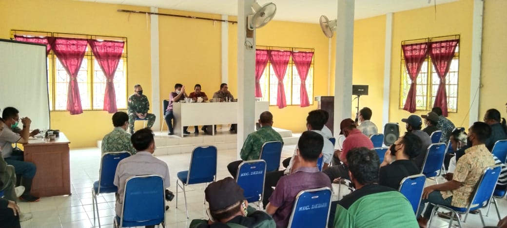 NASIONALXPOS.CO.ID, SINTANG (KALBAR) – Danramil 1205-08/Dedai, Kapten Inf W Gurning menghadiri kegiatan mediasi antara warga masyarakat dengan pihak perusahaan PT. BSL (Bumi Sentosa Lestari) di aula kantor Kecamatan Dedai Kabupaten Sintang, Jumat (25/06/2021).