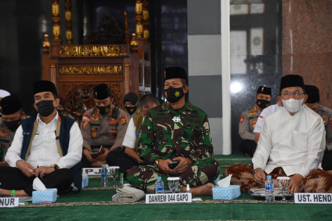 NASIONALXPOS.CO.ID, PALEMBANG. Danrem 044/Gapo Brigjen TNI Jauhari Agus Suraji SIP SSos, mengikuti acara Mujahadah Kubro dan Istighosah, di Mapolda Sumsel, Rabu (16/6/2021).