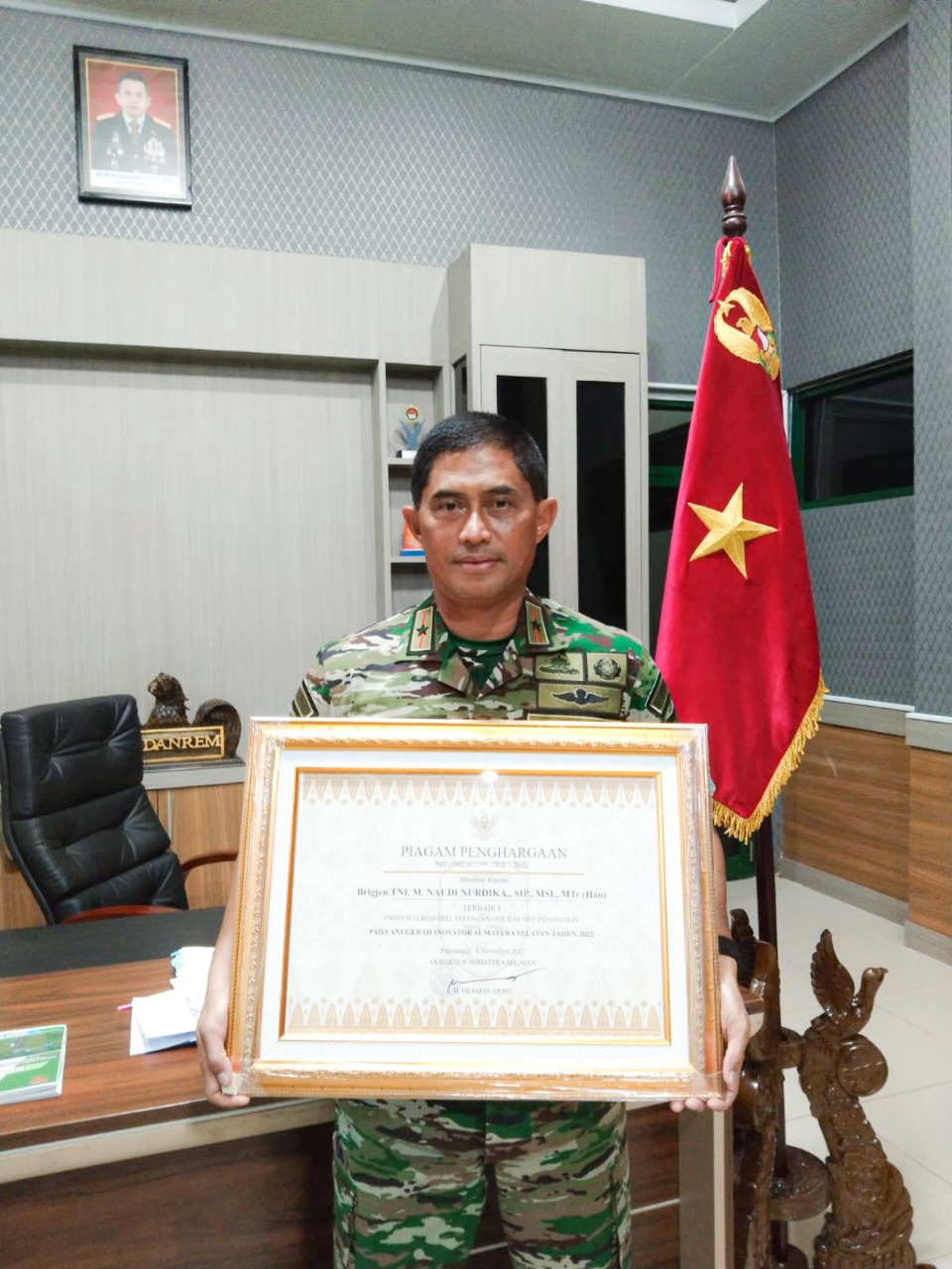 NASIONALXPOS.CO.ID, PALEMBANG – Komandan Korem 044/Garuda Dempo (Gapo), Brigjen TNI M. Naudi Nurdika, S.I.P., M.Si., M. Tr (Han)., menerima penghargaan dari Gubernur Sumsel H. Herman Deru. Penghargaan tersebut diberikan atas inovasi yang diciptakan Danrem 044/Gapo dapat memberikan manfaat dan dirasakan bagi masyarakat Sumsel.