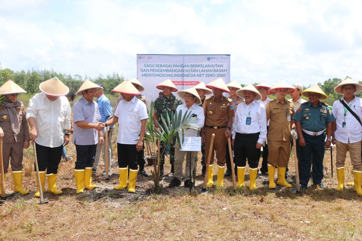 NASIONALXPOS.CO.ID, BANGKA BELITUNG – Komandan Korem 045/Garuda Jaya, Brigjen TNI A. Dedy Prasetyo, S.I.P., bersama Forkopimda Provinsi Bangka Belitung Ikut Serta bersama Kepala Staf Kepresidenan (KSP) Jenderal (Purn) DR. Moeldoko, S.I.P., MA, menanam secara simbolis pohon sagu pada kegiatan pencanangan penanaman sejuta tanaman sagu dan penandatangan serta deklarasi sagu sebagai pangan berkelanjutan pengembangan hutan lahan basah menyongsong Indonesia Net Zero 2060, di Kampung Reklamasi PT Timah Tbk Desa Air Jangkang Kabupaten Bangka, Provinsi Kepulauan Bangka Belitung, Selasa (08/08/2023).