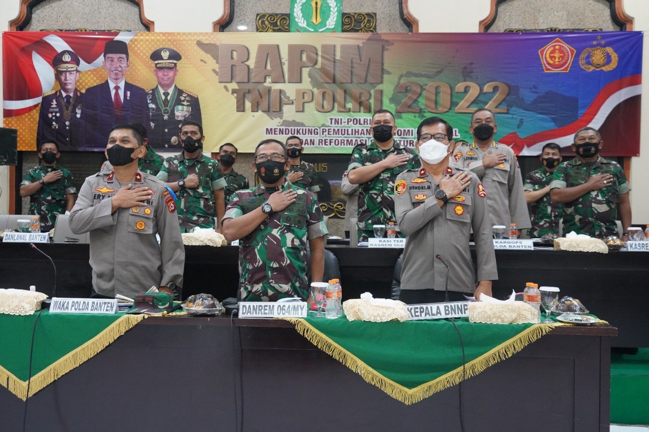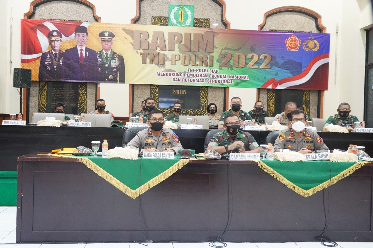 Rapim ini langsung dibuka oleh Presiden RI Ir H. Joko Widodo tersebut dilaksanakan di Markas Besar TNI Cilangkap Jakarta Timur dan diikuti secara virtual oleh pejabat TNI Polri di kewilayahan. Sedangkan di Banten sendiri mengikuti dari Aula Baluwarti Makorem 064/MY.