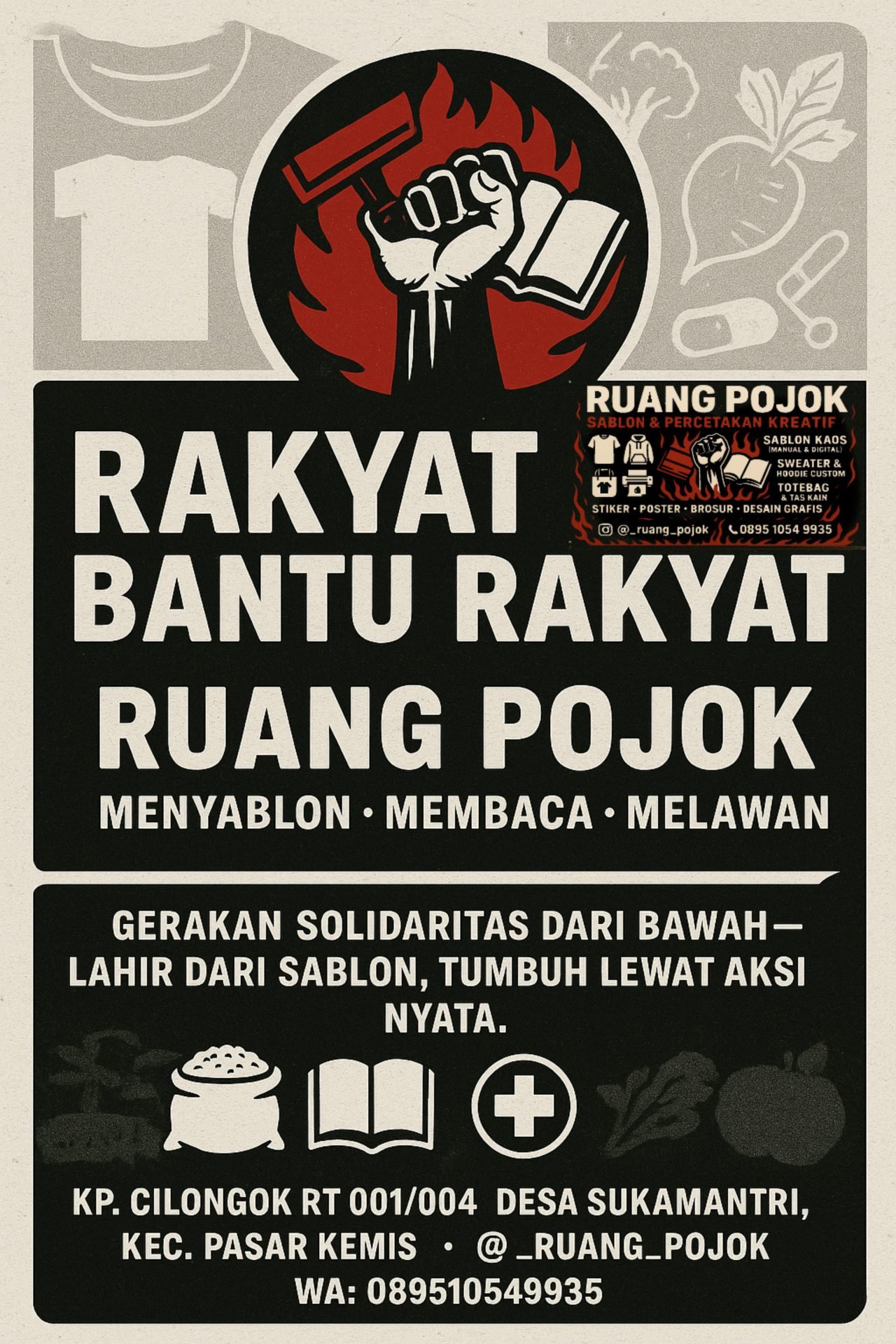 Ruang Pojok menjadikan kaos sebagai media pesan. Setiap sablon bukan hanya estetika, tapi juga suara perlawanan terhadap ketidakadilan sosial. Dengan memakai kaos ini, masyarakat ikut menyuarakan bahwa kepedulian adalah bentuk paling radikal dari cinta terhadap rakyat.