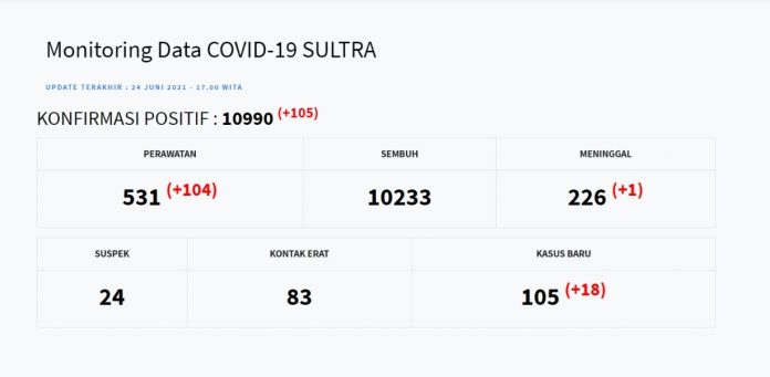 Dengan bertambahnya 105 pasien yang tersebar di beberapa kabupaten/kota di Sultra, kini total pasien yang terkonfirmasi positif Covid-19 berjumlah 10.990 orang. Dengan rincian 531 pasien tengah menjalani perawatan, 10.233 pasien sembuh dan 226 pasien meninggal dunia.