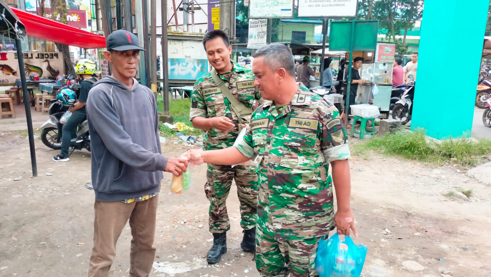 Bagi-bagi takjil ini, dipimpin Danramil 418-03/Plaju yang diwakili Peltu Herman beserta para Anggota Koramil 418-03/Plaju. Takjil tersebut dibagikan kepada pejalan kaki, petugas kebersihan, driver gojek dan tukang becak.