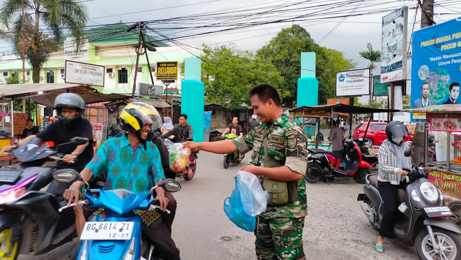 Bagi-bagi takjil ini, dipimpin Danramil 418-03/Plaju yang diwakili Peltu Herman beserta para Anggota Koramil 418-03/Plaju. Takjil tersebut dibagikan kepada pejalan kaki, petugas kebersihan, driver gojek dan tukang becak.