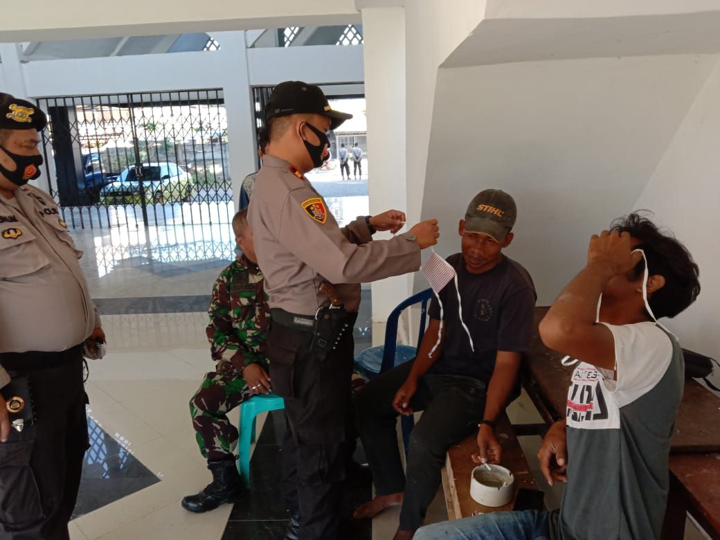 Kapolsek Pallangga bersama Kanit Binmas AIPTU Syamsu Alam membagikan masker kepada warga dikelurahan pallangga selanjutnya memberikan pemahaman tentang bahaya Covid-19.