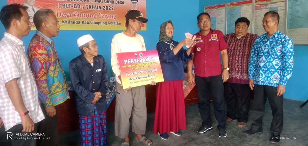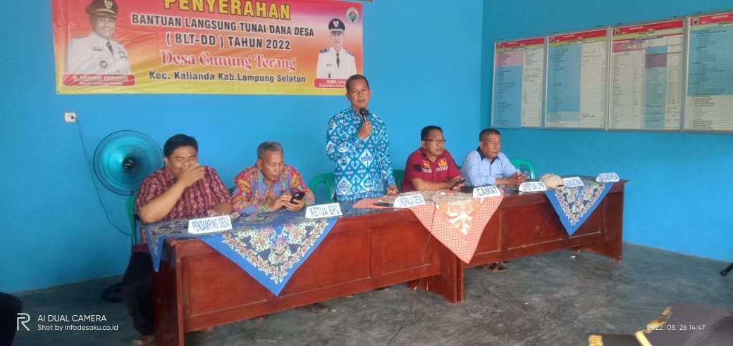 NASIONALXPOS.CO.ID, LAMSEL – Pemdes gunung terang realisasikan Bantuan Langsung Tunai sumber dari Dana Desa (BLT-DD) Tahap 3, Tahun 2022, kepada 90 Keluarga Penerima Manfaat (KPM), yang dilaksanakan di Balai Desa Gunung Terang, Kecamatan Kalianda, Kabupaten Lampung Selatan, Jumat (26/08/2022).