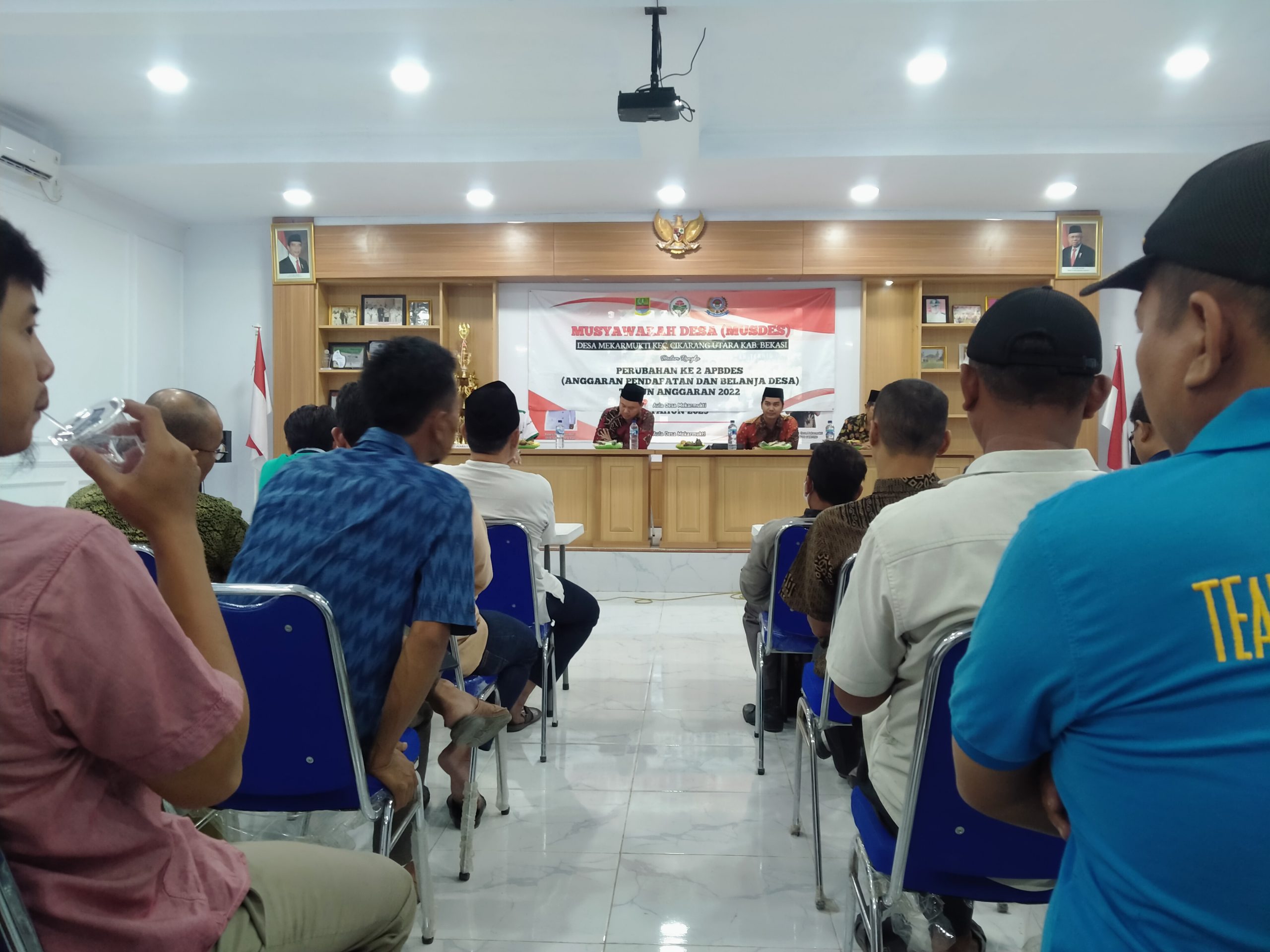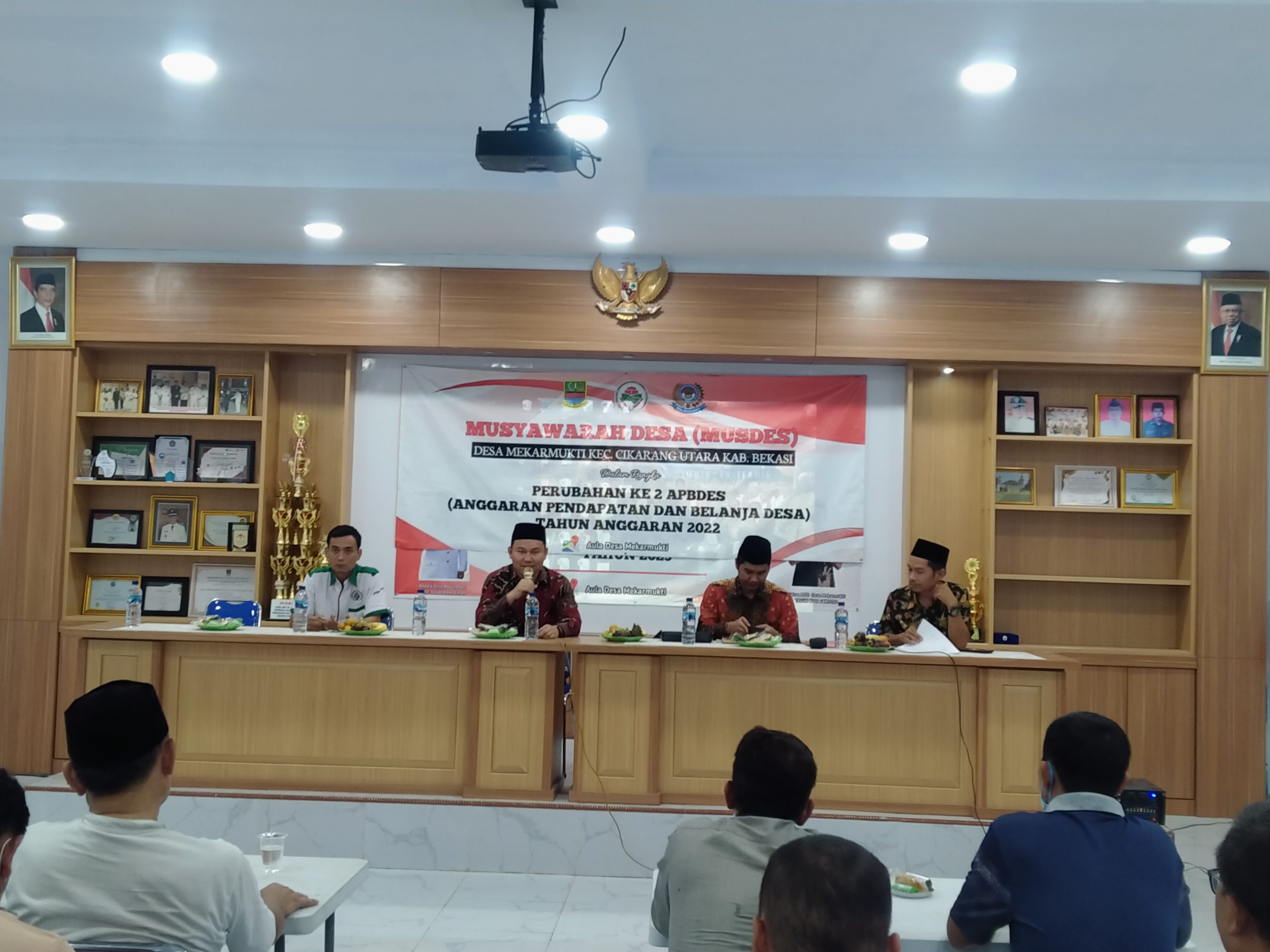 Musyawarah Desa (MUSDES) dan Penyusunan Rencana Kerja Pemerintah Desa, yang di hadiri oleh Kepala Desa Mekarmukti, Dede Sulaeman S.Kom, Pendamping Desa Se-Kecamatan cikarang utara Muhamad Sodiq, Ketua BPD Teguh Budi Santoso, hadir juga ketua BumDes desa mekarmukti Jaenudin, dan para RT, RW, Dusun, ketua karang taruna desa mekarmukti Suhanda Dolar, PKK, kader posyandu, dan para toko masyarakat yang ada di desa mekarmukti.