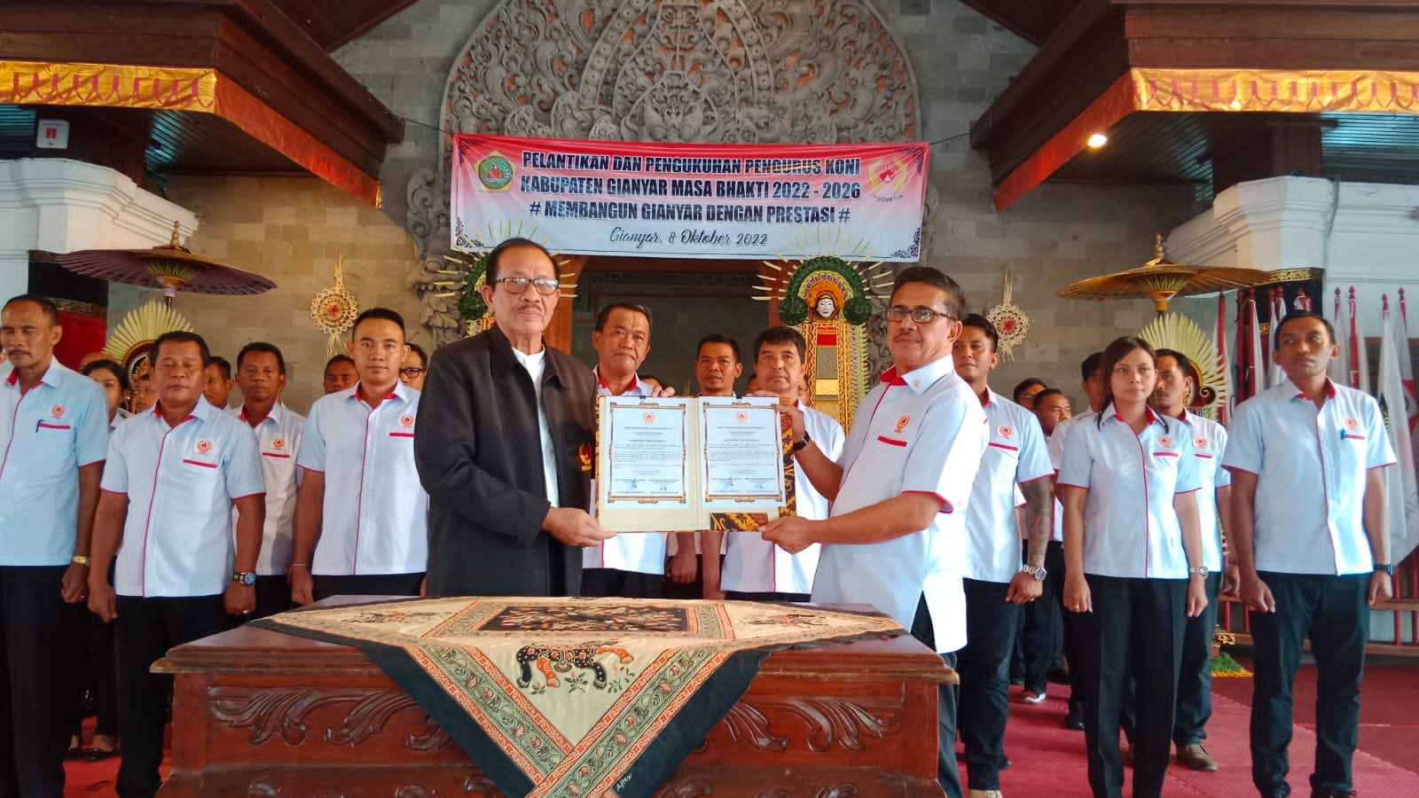 NASIONALXPOS.CO.ID, GIANYAR —Setelah melalui tahapan pemilihan, Dewa Gede Alit Mudiarta dilantik menjadi Ketua Umum Komite Olahraga Nasional Indonesia (KONI) Kabupaten Gianyar Tahun 2022 hingga 2026 oleh Ketum KONI Bali I Gusti Ngurah Oka Darmawan di Balai Budaya Gianyar, Sabtu (8/10/2022). Oka Darmawan berharap di bawah kepengurusan yang baru, Koni Gianyar diharapkan mampu meningkatkan prestasi keolahragaan.
