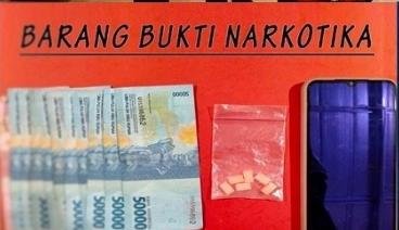 Dalam penindakan petugas menyita 6 (enam) butir tablet warna orange diduga Narkotika jenis ekstasi yang ditemukan pada kantong jaket warna coklat yang digunakan TSK KM serta mengamankan uang tunai sejumlah Rp 600.000 dan 1 (satu) unit handphone warna putih milik TSK.