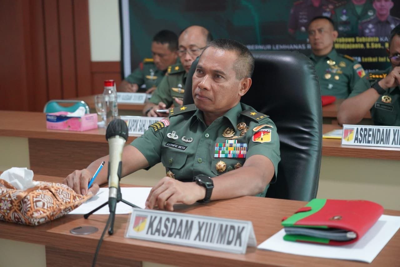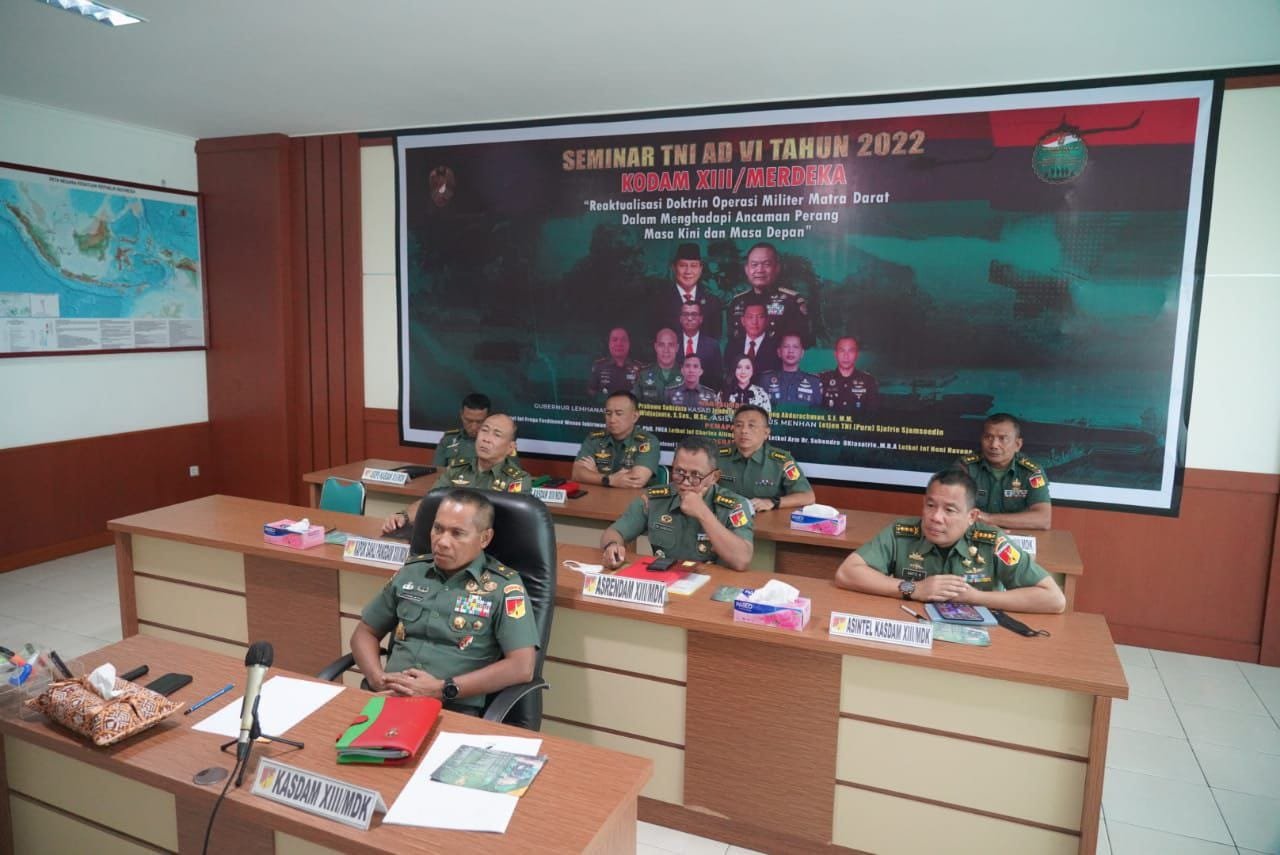 NASIONALXPOS.CO.ID, MANADO  –  Kasdam XIII/Merdeka Brigjen TNI Luthfie Beta, S, Sos,M.Si, Kapoksahli Pangdam XIII/Merdeka Brigjen TNI, E. J. Lumintang S.I.P dan para asisten Kasdam XIII/Merdeka, mengikuti seminar TNI AD VI tahun 2022, yang dibuka oleh Kepala Staf Angkatan Darat (KSAD) Jenderal TNI Dr. Dudung Abdurachman, S.E., M.M, secara virtual, Senin (27/6/2022).