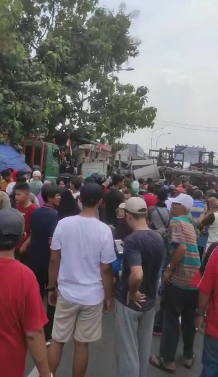 Diduga Mengantuk Supir Kontainer Menabrak Sejumlah Motor yang Terparkir disisi Jalan