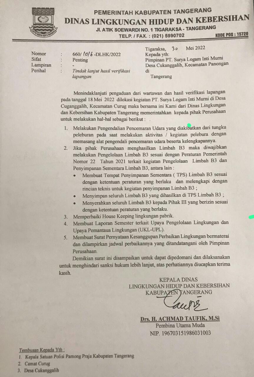 Dinas Lingkungan Hidup dan Kebersihan Kabupaten Tangerang melayangkan surat perintah kepada perusahaan tersebut yang isinya agar perusahaan dimaksud dalam menjalankan usahanya harus senantiasa mengedepankan kepentingan umum ketimbang kepentingan bisnis semata.