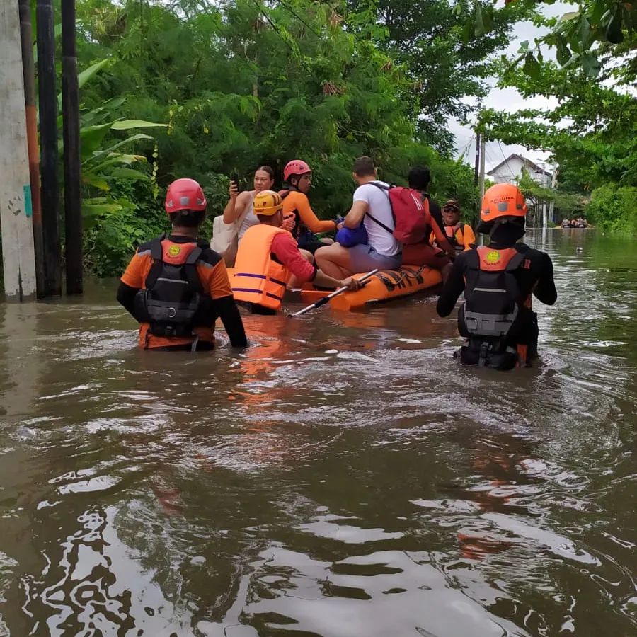 NASIONALXPOS.CO.ID, DENPASAR -Personel Ditsamapta Polda Bali bersama tim SAR gabungan mengevakuasi warga yang terjebak banjir akibat hujan deras mengguyur sebagian wilayah Kota Denpasar, Sabtu (8/10/2022).