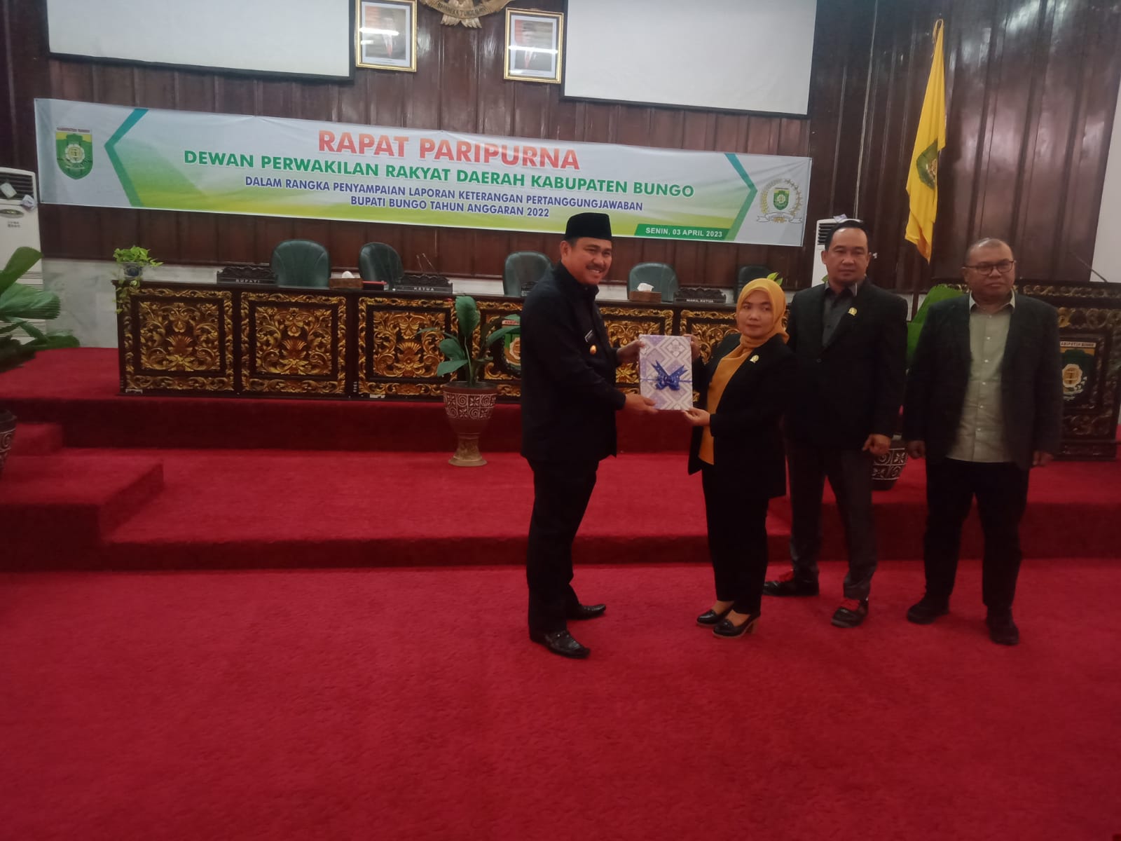 NASIONALXPOS.CO.ID, BUNGO – Dewan Perwakilan Rakyat Daerah (DPRD) Kabupaten Bungo menggelar rapat paripurna dalam rangka Penyampaian Laporan Keterangan Pertanggungjawaban (LKPj) Bupati Bungo Tahun Anggaran 2022 yang dilaksanakan di ruang Rapat Utama DPRD Bungo, Senin (03/04/2023).