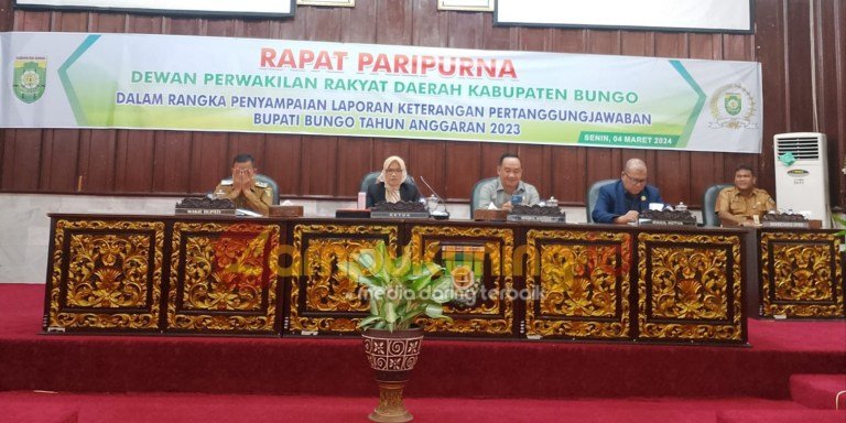 NASIONALXPOS.CO.ID, BUNGO – Dewan Perwakilan Rakyat Daerah (DPRD) Kabupaten Bungo menggelar Rapat Paripurna dalam Rangka Penyampaian Laporan Pertanggungjawaban Bupati Bungo Tahun Anggaran 2023, Senin (04/03/2024).