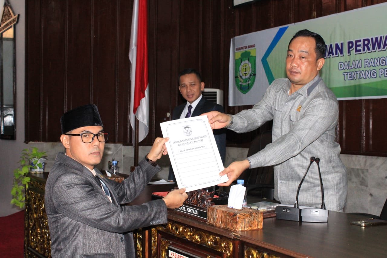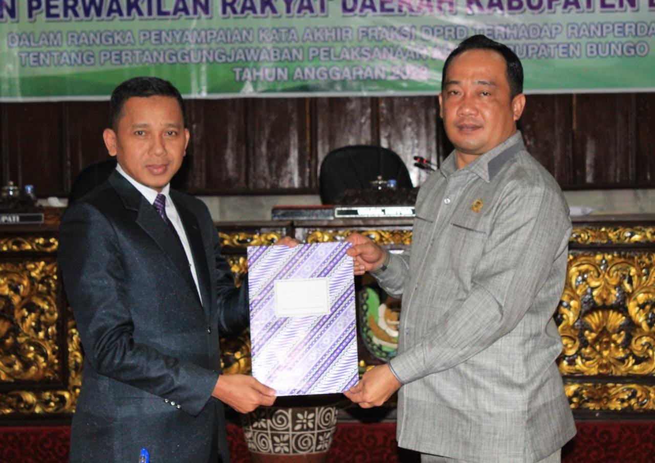 Jumiwan Aguza, SM dalam sambutannya mengatakan, untuk mendapat persetujuan bersama dalam seluruh tahapan pembahasan yang dilaksanakan beberapa hari waktu lalu pimpinan dan anggota DPRD Bungo serta perwakilan OPD telah memberikan masukan pertanyaan dan pendapat terhadap Ranperda ini serta telah diberi tanggung jawab oleh Pemerintah Daerah kepada DPRD.