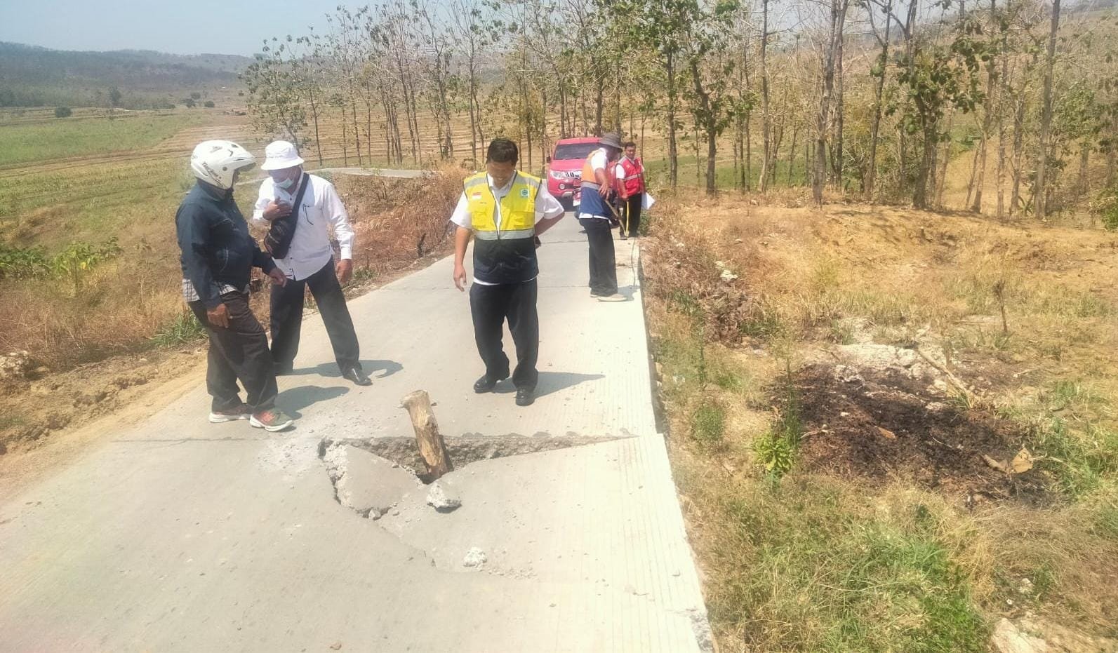 Tampak dilapangan pegawai dari PU Blora melakukan pemeriksaan diberbagai titik lokasi jalan yang putus akibat longsor. Disamping itu, juga dilakukan pengukuran terhadap Blok Beton yang kondisi sudah rusak parah.