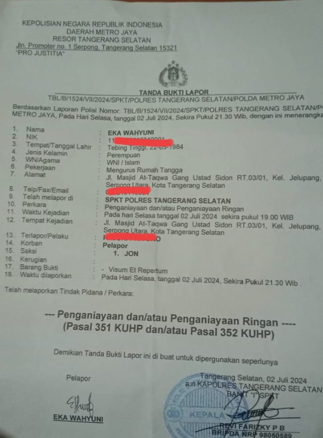 Sebelumnya, laporan dugaan penganiayaan tersebut tercatat dengan nomor registrasi TBL/B/1524/VII/2024/SPKT/Polres, tertanggal 2 Juli 2024. Menurut informasi yang dihimpun, dugaan penganiayaan itu terjadi ketika korban tidak mengizinkan terduga pelaku mengunci kamar setelah mengambil beberapa pakaiannya.