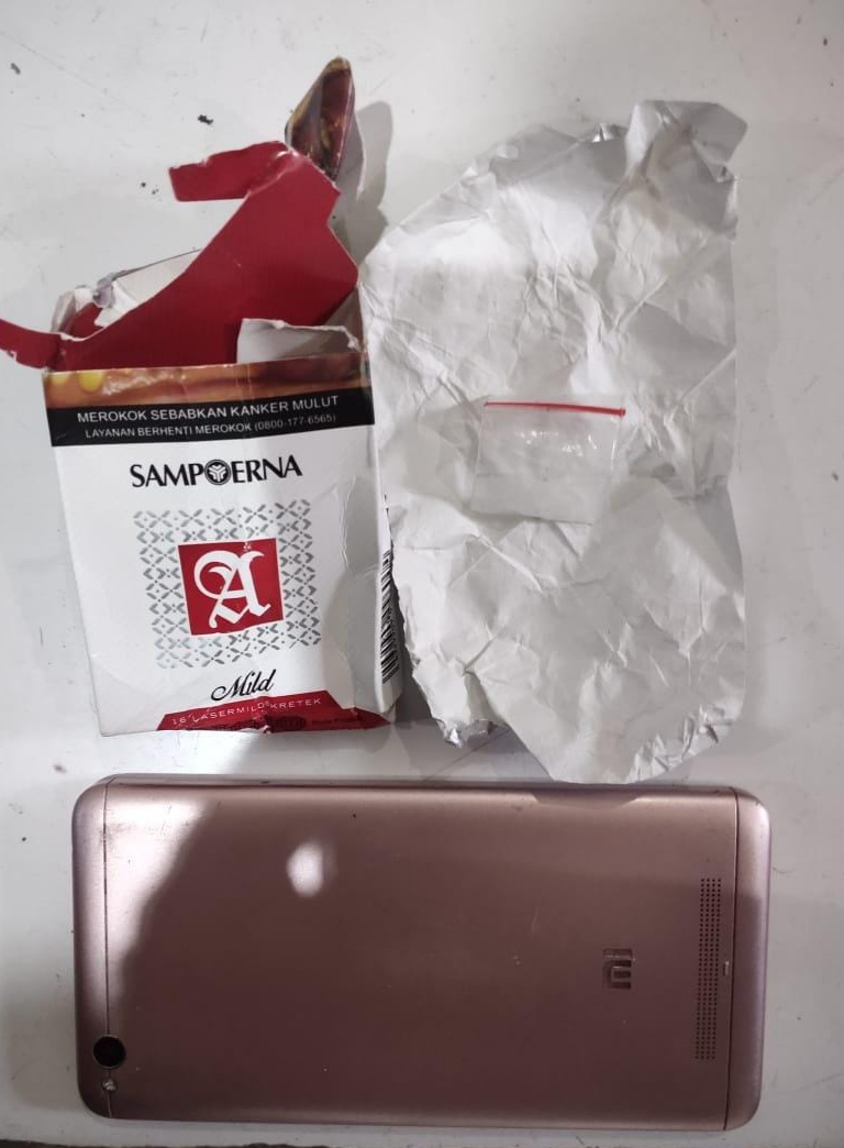 Dari tangan pelaku petugas mengamankan barang bukti, 1 ( Satu) bungkus klip plastik warna bening di duga narkotika jenis sabu dengan berat brutto 0,28 Gram dalam sebuah bungkus bekas rokok sampoerna Mild dan 1 (satu) Unit Telepon genggam/ HP merk Xiomi Readmi 4.A warna Pink Berikut SIM Card.