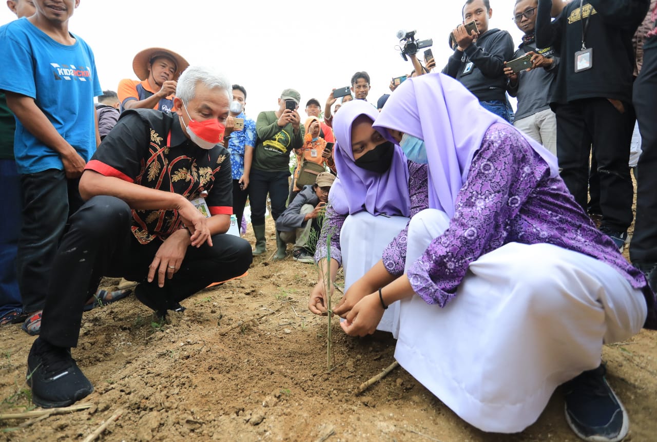 “Nah di area yang masih relatif gersang seperti ini, momentum musim hujan dipakai betul untuk menanam sebanyak-banyaknya. Tadi ada usulan dari Bupati soal tanaman buah dan pohon yang orang tidak mau menebang. PKK juga bisa masuk menanam daun kelor. Aren sebenarnya juga bagus karena menyimpan air.m sehingga nanti kita harapkan muncul sumber-sumber air,” jelas Ganjar.