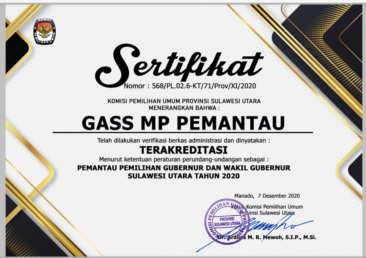 NASIONAL XPOS.CO.ID SULAWESI UTARA | Organisasi Relawan pemantau Pemilihan Umum (Pemilu) Pilkada serentak 2020 yang dikenal dengan nama GASS MP Sulawesi Utara. Telah terbentuk dan terakreditasi sertifikat pemantau KPU Sulut nomor 568 /PL.02.6-KT/71/prov/XI/2020 yang diserahkan langsung Ketua KPU Sulut Dr.Ardiles Mewoh. Relawan GASS MP Pemantau Pilkada Sulut Calon Gubernur dan Wakil Gubernur Berfungsi sebagai berikut Fokus pengawasan / pengawasan: