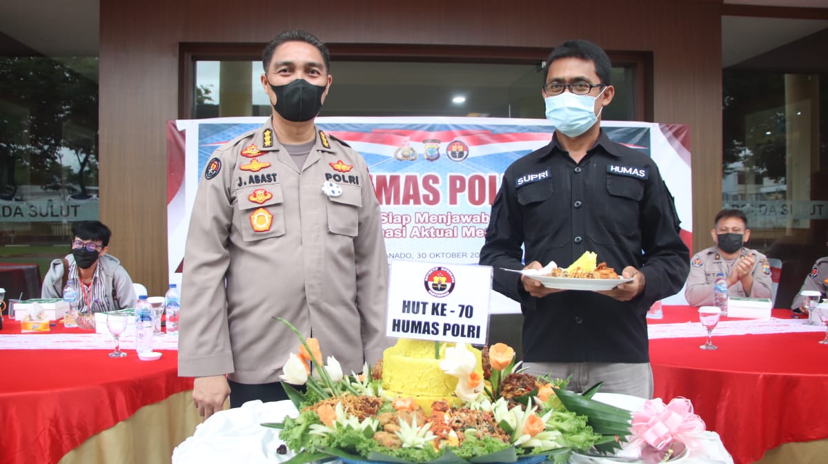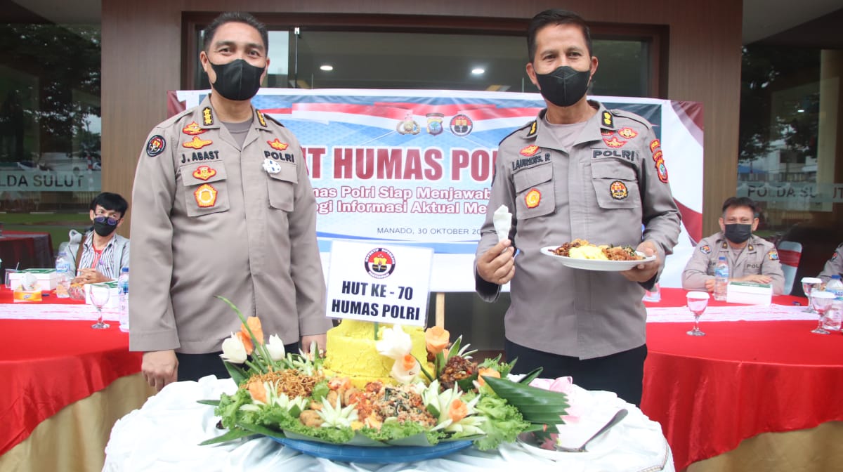 NASIONAL XPOS.CO.ID MANADO| Humas Polri berulang tahun ke-70 yang jatuh pada tanggal 30 Oktober 2021 hari ini. Peringatan Hari Ulang Tahun (HUT) Humas Polri di Polda Sulut digelar secara sederhana di lobi lantai 1 Mapolda, ditandai dengan pemotongan tumpeng oleh Kabid Humas Polda Sulut Kombes Pol Jules Abraham Abast,Minggu ( 31/10/2021).
