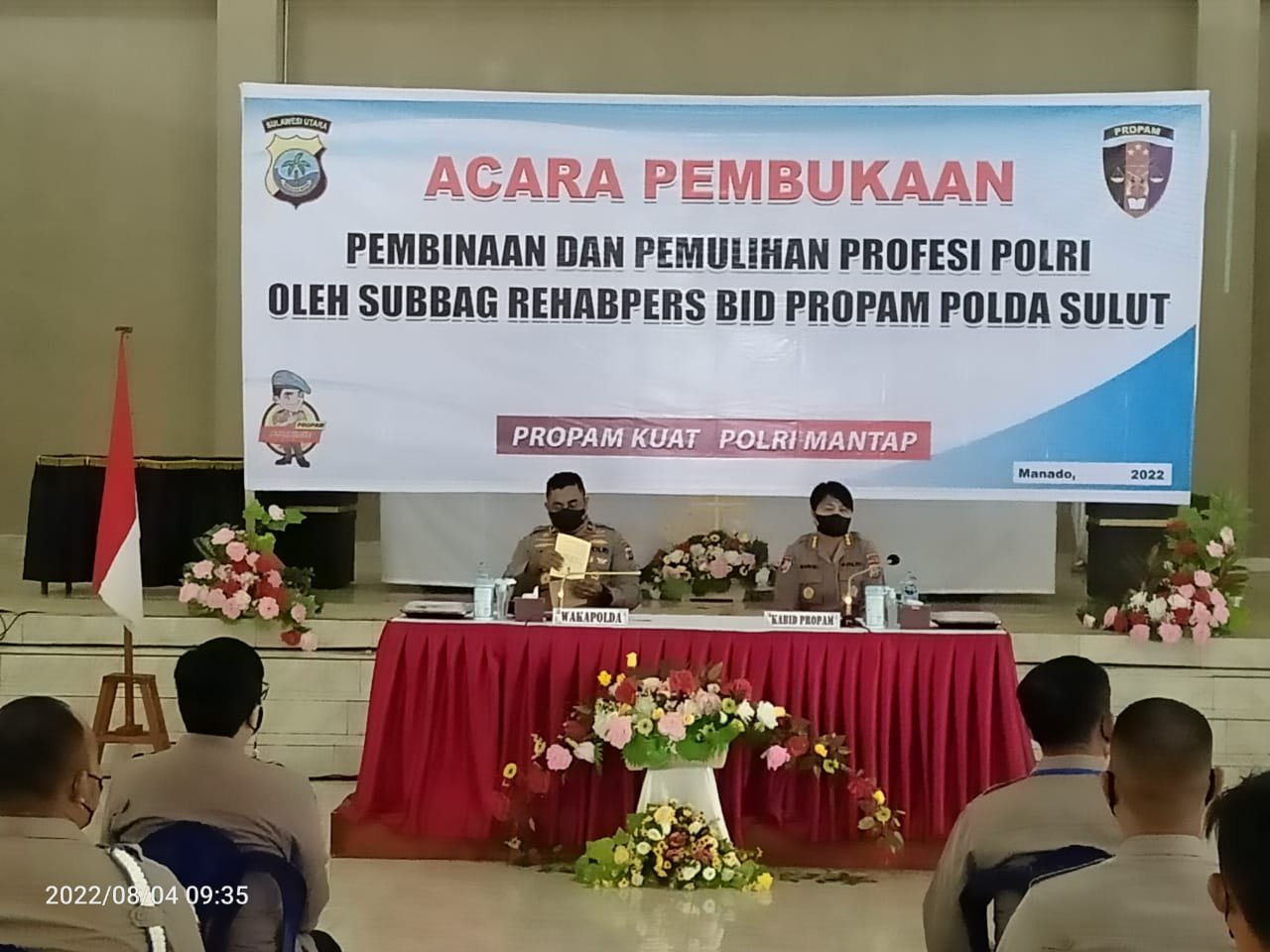 Kegiatan diawali dengan laporan kegiatan oleh Kasubbid Paminal Propam Polda Sulut AKBP Alkat Karouw,S.Sos dan Ketua Panitia Kompol Fenti J. Kawulur yang juga adalah Kasubbid Provos Bid Propam Polda Sulut, dan dilanjutkan dengan Pembukaan Kegiatan Pembinaan dan Pemulihan Profesi Polri.