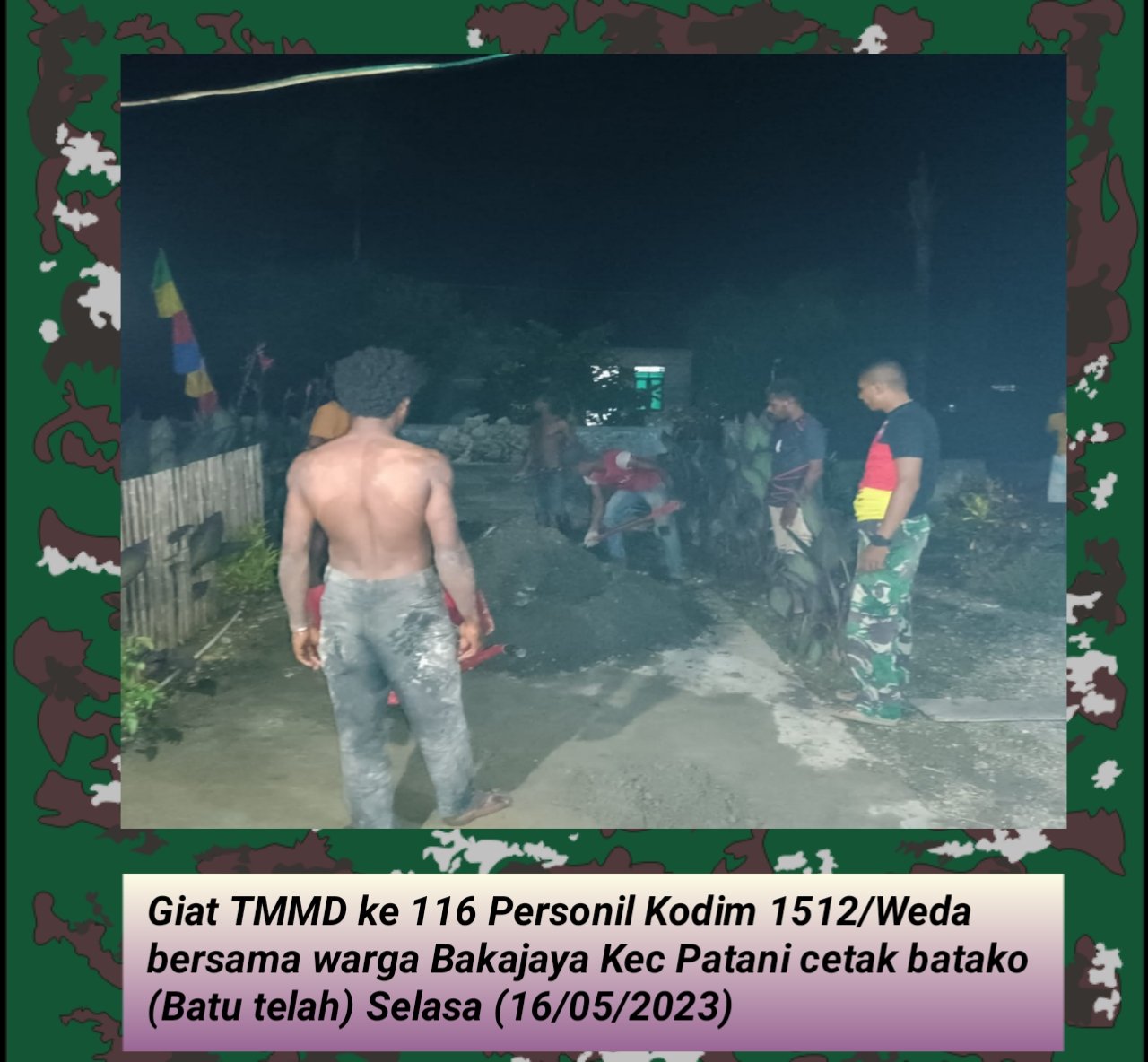 Diantara giat gotong royong TNI bersama warga dilokasi TMMD ke 116 diantaranya membangun rumah warga tidak layak huni (RTLH), pembangunan pasar dan kegiatan pencetakan batako (Batu telah) tepat di Desa Baka Jaya Kecamatan Patani, serta sejumlah kegiatan sosial yang lain.