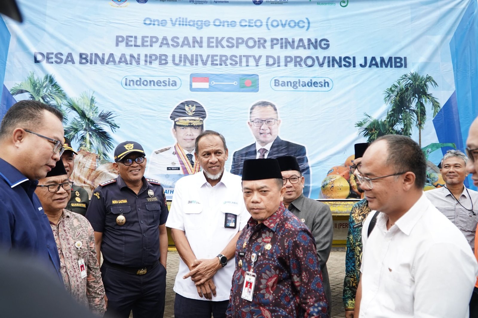 NASIONALXPOS.CO.ID, JAMBI – Gubernur Jambi Dr. H. Al Haris, S.Sos. MH mengapresiasi Institut Pertanian Bogor (IPB) melalui program One Village One CEO IPB yang bukan saja mencetak sarjana melainkan langsung mencetak pengusaha muda pemimpin suatu perusahaan, yang langsung terjun kemasyarakat melihat pasar atau peluang yang tepat. Apresiasi tersebut disampaikannya saat Pelepasan Ekspor Komoditas Pinang Desa Binaan IPB ke Bangladesh oleh PT Export Tani Nusantara (Binaan Direktorat Pengembangan Masyarakat Agromaritim) IPB University, bertempat di Pelabuhan Talang Duku Regional II, Kabupaten Muaro Jambi, Kamis (24/04/2025) pagi.