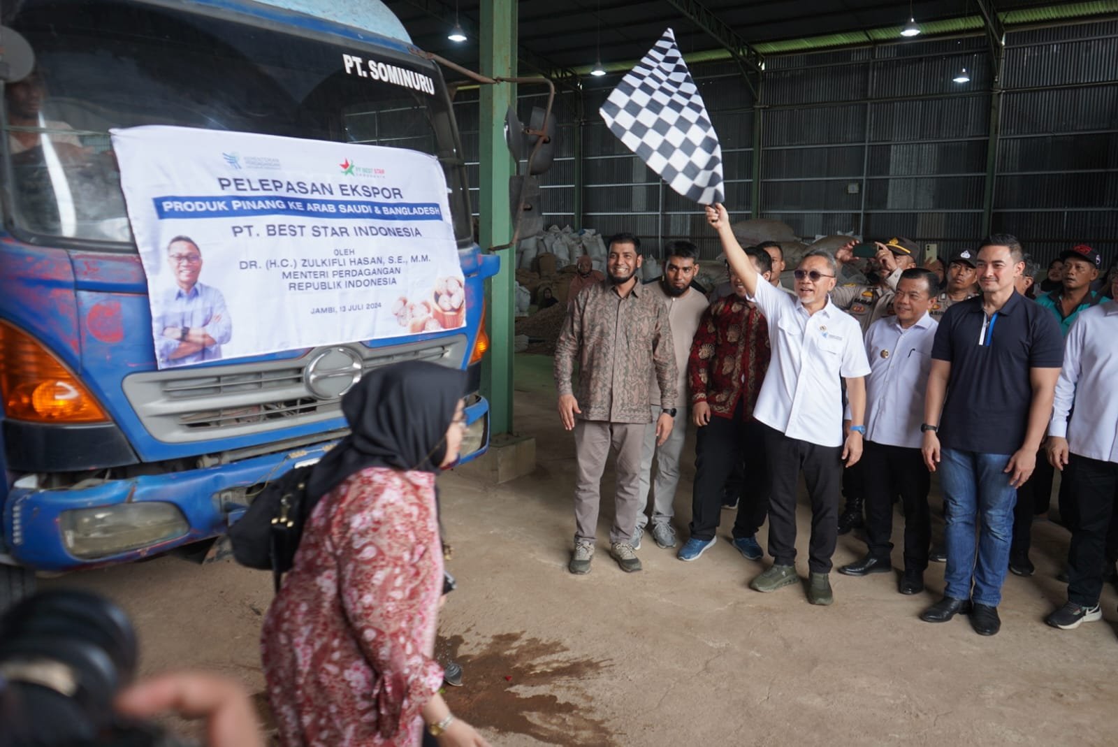 NASIONALXPOS.CO.ID, JAMBI – Gubernur Jambi Dr. H. Al Haris, S.Sos, MH mendampingi Menteri Perdagangan (Mendag) RI Zulkifli Hasan (Zulhas) melepas ekspor pinang Jambi ke Arab Saudi dan Bangladesh di gudang PT. Best Star Indonesia, Kumpeh Ulu, Kabupaten Muaro Jambi, Sabtu (13/07/2024).