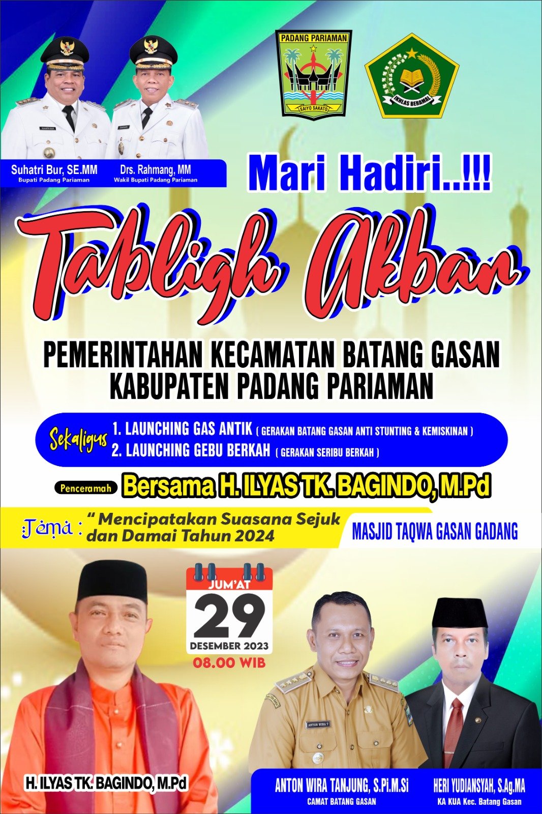 NASIONALXPOS.CO.ID, SUMBAR – Dalam rangka menghadapi Tahun 2024, pemerintah Kecamatan Batang Gasan melaksanakan tabligh Akbar untuk menciptakan suasana sejuk dan damai sekaligus melounciing Dua inovasi Sekaligus Pertama, Gas Antik (Gerakan Batang Gasan Anti Stunting dan kemiskinan) serta Gebu Berkah (Gerakan Seribu Berkah) yang intinya adalah untuk meningkatkan kepedulian Pemerintah terhadap permasalahan sosial ditengah masyarakat.