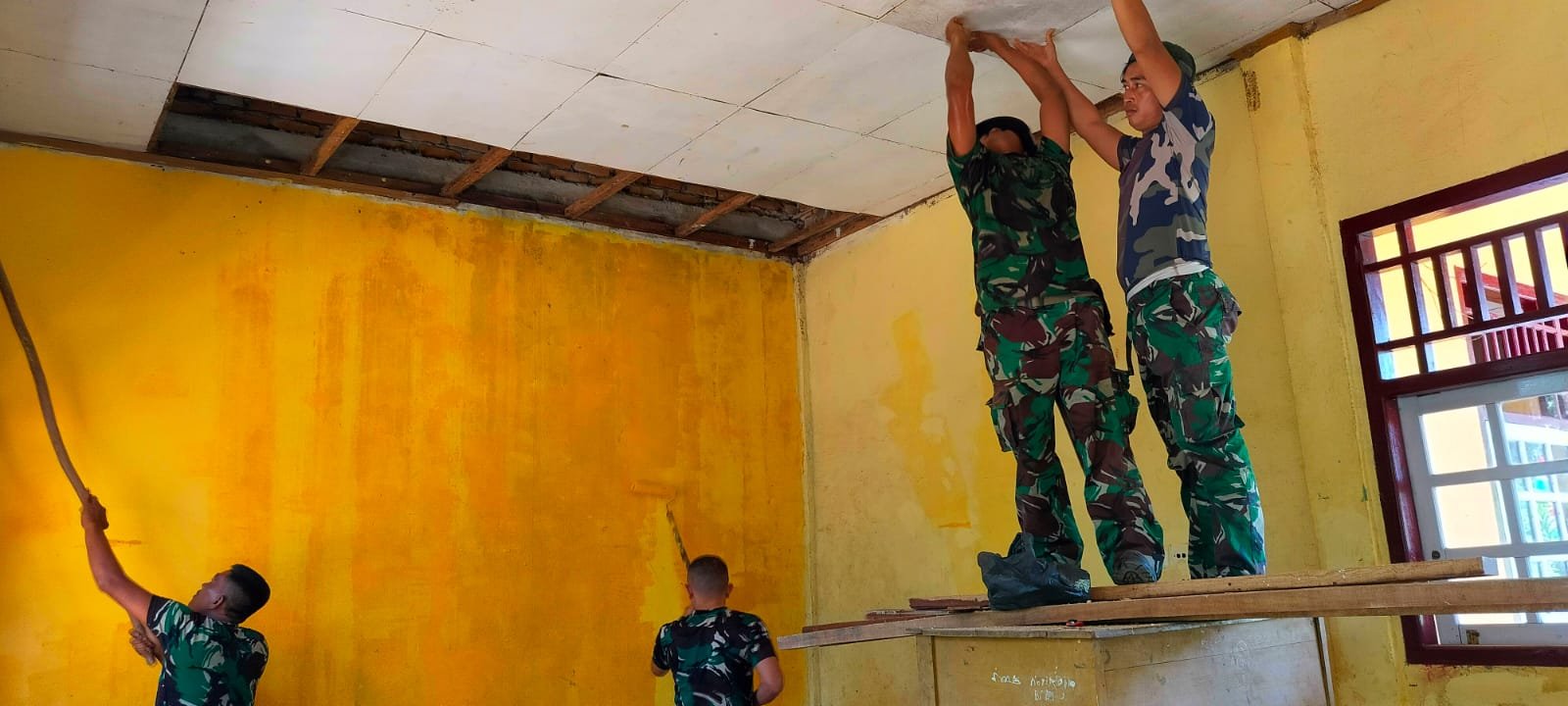 “Prajurit Satgas bekerja keras memasang satu persatu rangka plafon, dan mengecat SD 57/II pengerjaan yang telah dimulai semenjak Pra TMMD tersebut terus dikebut,” ucap Kapten Inf Wakhid Nurohim. (is)