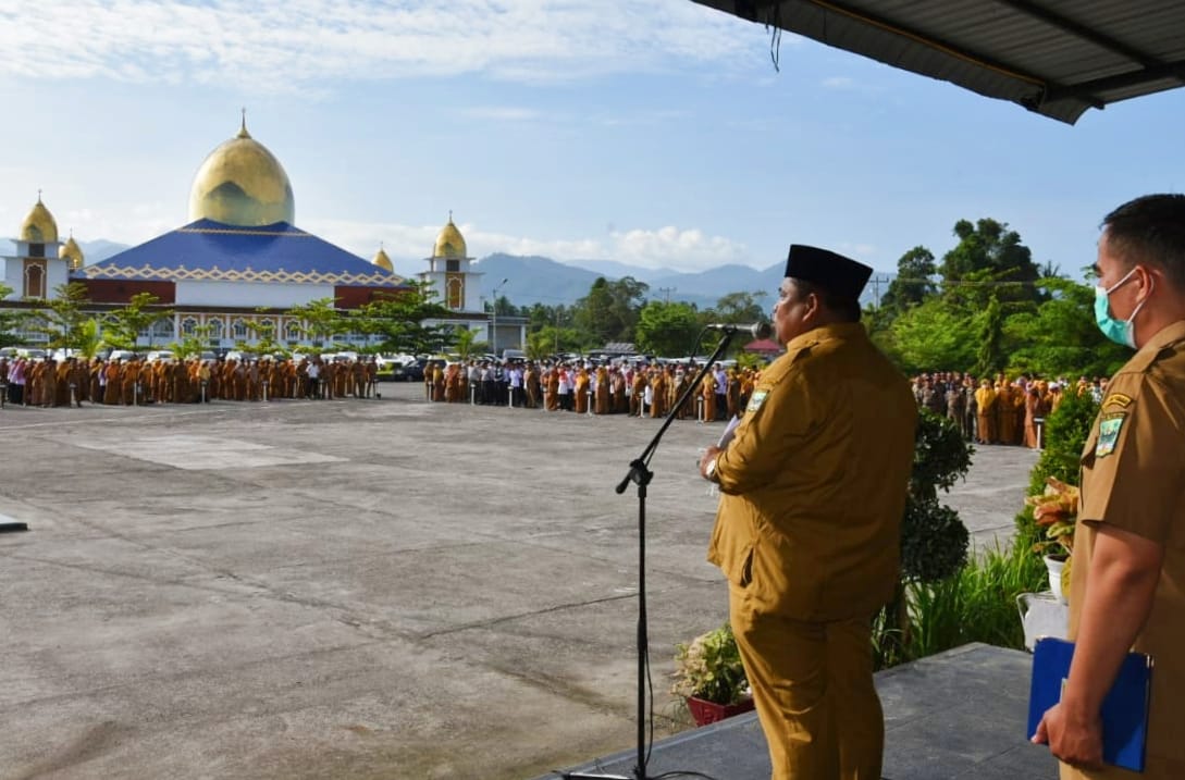 Apel bulanan Aparatur Sipil Negara (ASN) Padang Pariaman yang bertepatan dengan awal masuk kerja pasca cuti bersama lebaran Idul Fitri 1443 H, dilaksanakan di halaman Kantor Bupati di Nagari Parik Malintang Kecamatan Anam Lingkuang, pada Senen (9/5).