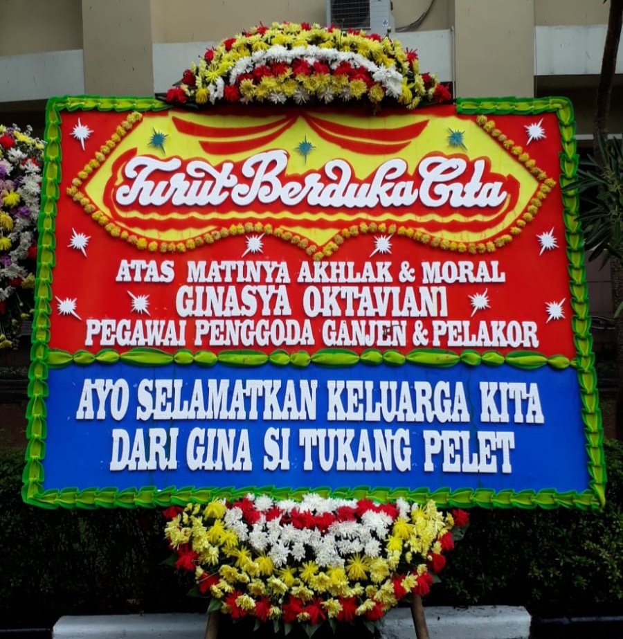 Adapun tulisan dari Karangan Bunga itu Turut Berduka Cita Atas Matinya Akhlak dan Moral Ginasya Oktaviani Pegawai Penggoda Ganjen dan Pelakor.