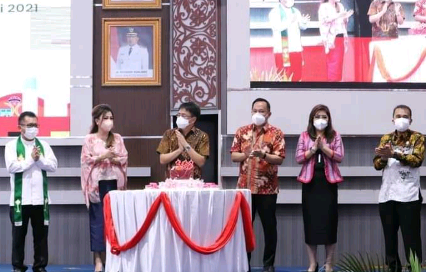 NASIONAL XPOS.CO.ID MANADO | Wali Kota Andrei Angouw dan Wakil Wali Kota Richard Sualang didampingi Ketua dan Sekretaris Tim Penggerak PKK Kota Manado Irene Angouw Pinontoan dan Merry Sualang Mawardi menghadirì Ibadah syukur HUT ke-398 Kota Manado Yang di gelar di Aula Serbaguna Pemerintah Kota Manado, Kamis (22/7/21).
