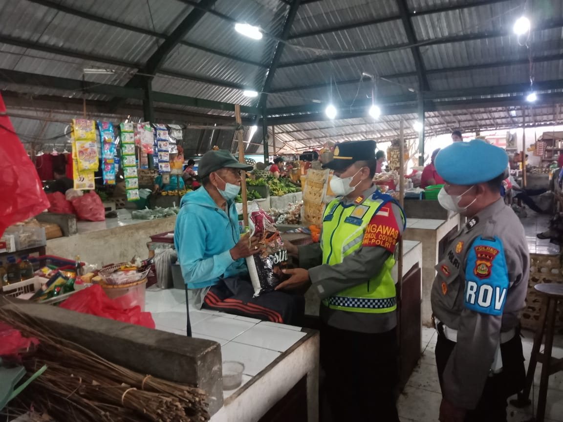 Kegiatan pemberian bantuan dilakukan Kapolsek Kubu berlangsung didalam Pasar Rubaya, saat melaksanakan giat pemantauan dan pengawasan penerapan protokol kesehatan dipasar.