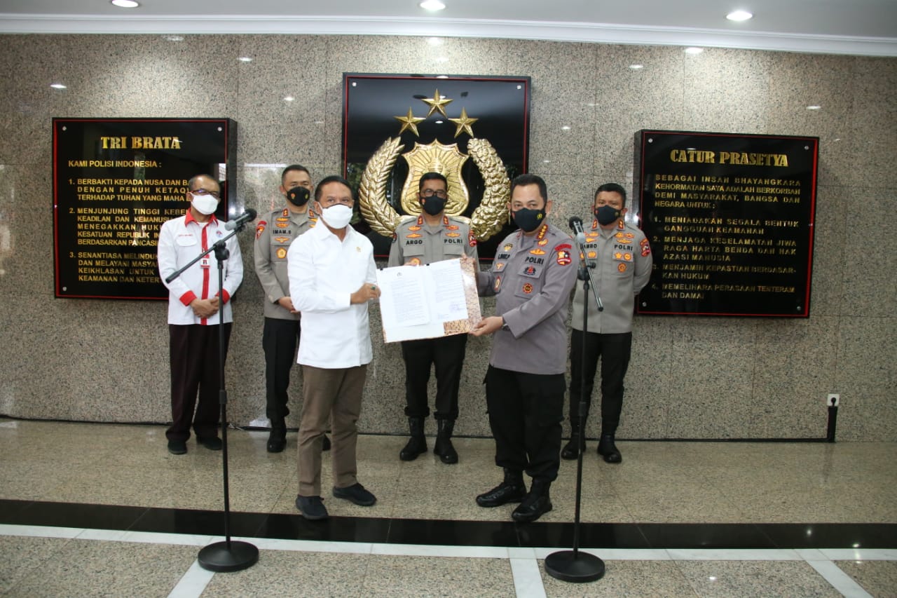NASIONALXPOS.CO.ID, JAKARTA- Menteri Pemuda dan Olahraga Zainudin Amali bertemu dengan Kapolri Jenderal Listyo Sigit Prabowo di Mabes Polri, Jakarta, Senin (23/8/2021). Pertemuan ini guna membahas izin penyelenggaraan liga 1 dan 2 yang sempat terhenti karena pandemi COVID-19.