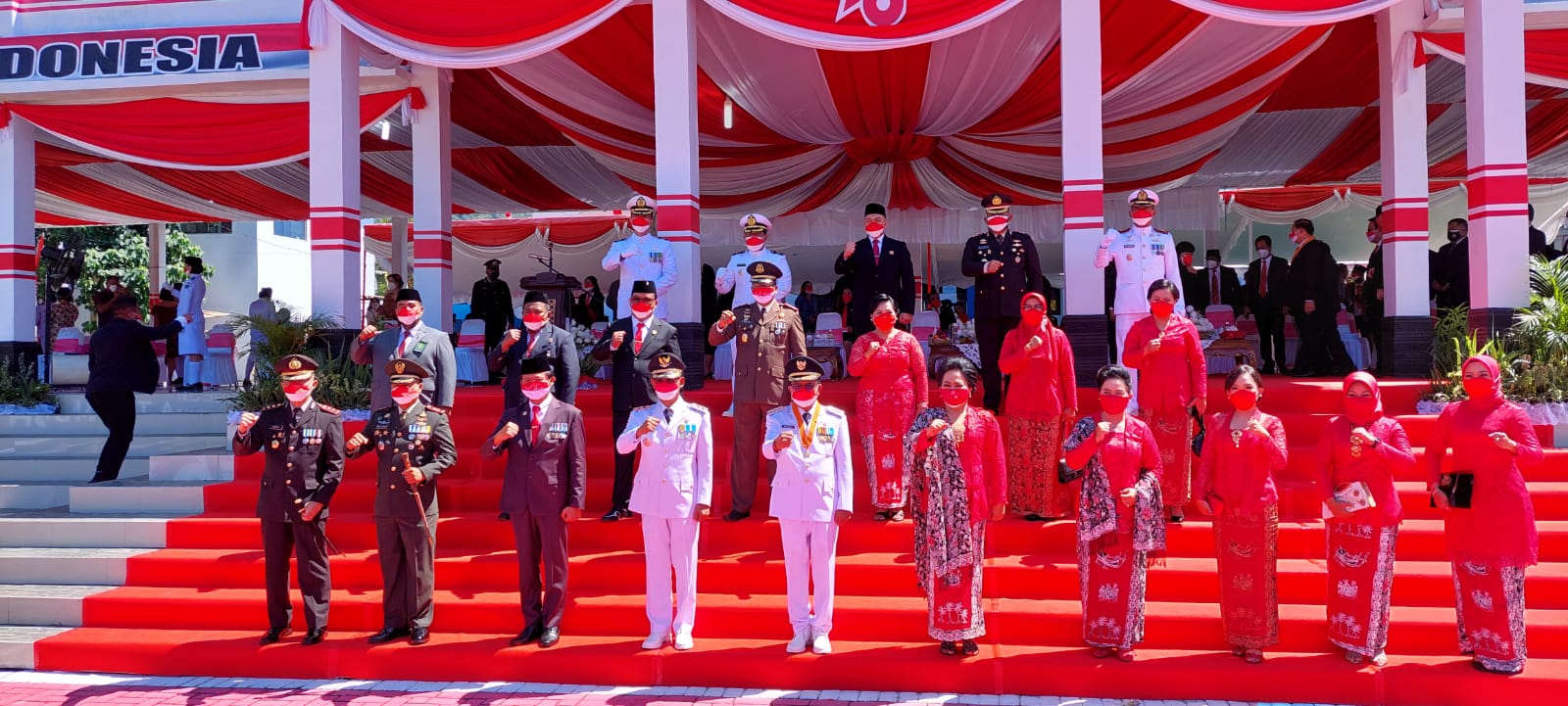NASIONALXPOS.CO.ID KOTA BITUNG| Pemerintah Kota Bitung Memperingati HUT RI ke-76 dengan menggelar Upacara Bendera yang diikuti Seluruh Jajaran SKPD dan Forkopimda di Lapangan Upacara Kantor Walikota Bitung, Selasa (17/8/2021).
