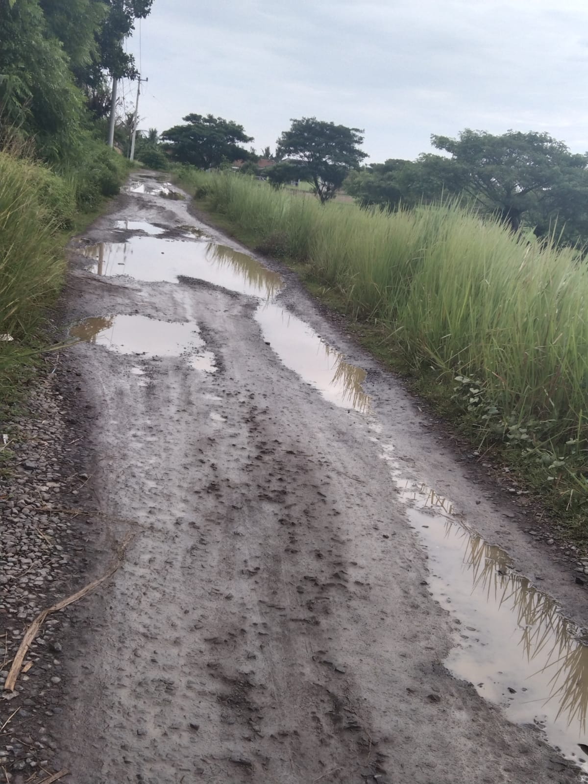 Di saat musim kemarau jalan berdebu dan berbatu, namun saat musim hujan kondisi jalan licin dan becek penuh genangan air hingga para warga yang melintas harus hati – hati apalagi di saat musim hujan pejalan kaki harus melepas sepatu dan sendal.