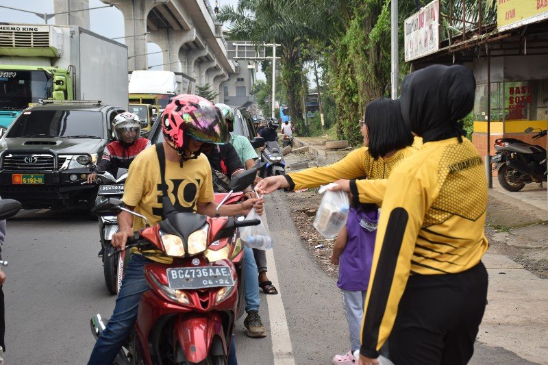 Disambut dengan penuh antusias, takjil dibagikan kepada para pejalan kaki, pengendara dan sopir angkot yang melintas menjelang waktu berbuka puasa.