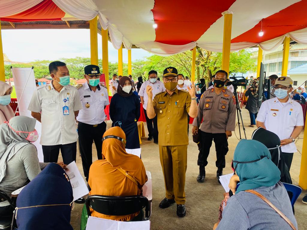 NASIONALXPOS.CO.ID, KONSEL/SULTRA -Pemerintah Kabupaten Konawe Selatan (Konsel), sukses melaksanakan vaksin massal serentak diseluruh Kecamatan, yang disaksikan langsung Presiden RI Jokowi melalui layar yang terpasang di Halaman Upacara Kantor Gubernur Sultra, saat memberikan arahan para Kepala Daerah dan Unsur Forkopimda se-Sultra secara luring dan daring, Rabu (30/6/2021).