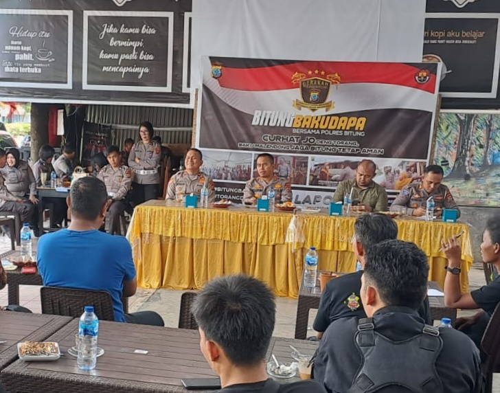 NASIONALXPOS.CO.ID.KOTA BITUNG,-Jumat, 6 Januari 2023 Pukul 09.15 WITA bertempat di Bosshe Cafe Kecamatan Maesa Kota Bitung telah dilaksanakan kegiatan Jumat Curhat Bitung Baku dapa bersama Kapolres Bitung “Curhat jo deng torang baku malendong jaga Bitung tetap aman”.