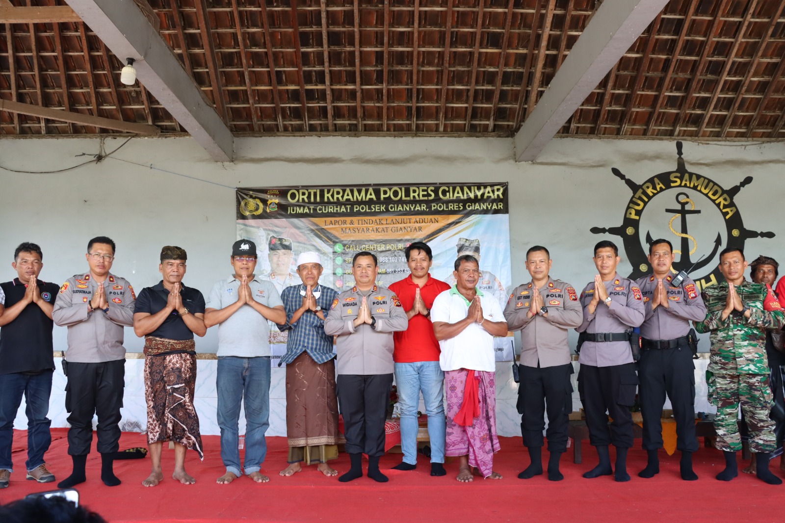 Kapolres Gianyar, AKBP. Ketut Widiada menyampaikan dalam sambutannya, bahwa kedatangan pihak kepolisian saat ini dalam rangka program “Jumat Curhat” bertujuan meningkatkan pelayanan Polres Gianyar, mendekatkan diri kepada masyarakat, serta dapat mengetahui permasalahan juga aspirasi dari masyarakat, sesuai dengan Tugas Pokok Polri, Melayani, Melindungi, serta Mengayomi.