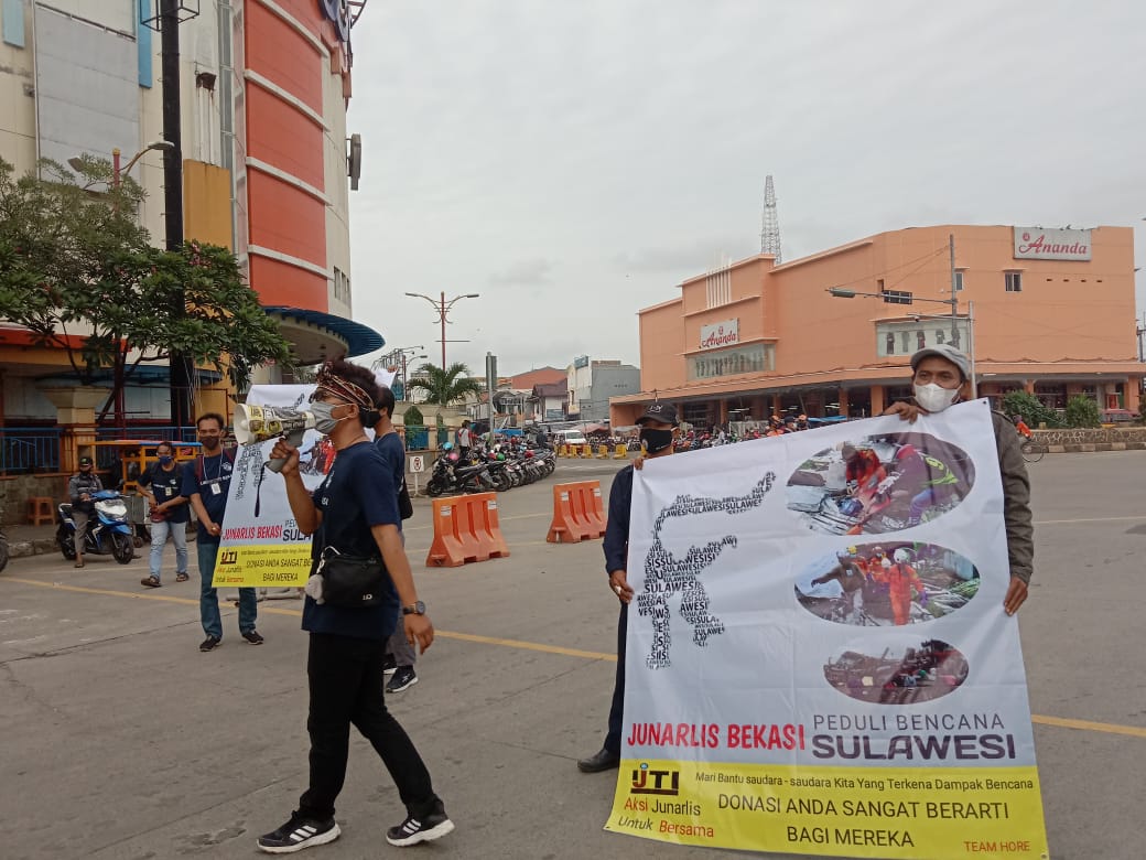 “aksi yang kami lakukan sebagai bentuk rasa prihatin kami sebagai jurnalis Bekasi yang tergabung dalam ikatan jurnalis televisi Indonesia Bekasi raya, atas musibah yang menimpa warga yang berada di daerah sulawesi dan Kalimantan” tutur Rahmat Haikal Majid atau lebih akrab di sapa Cang Tubis.