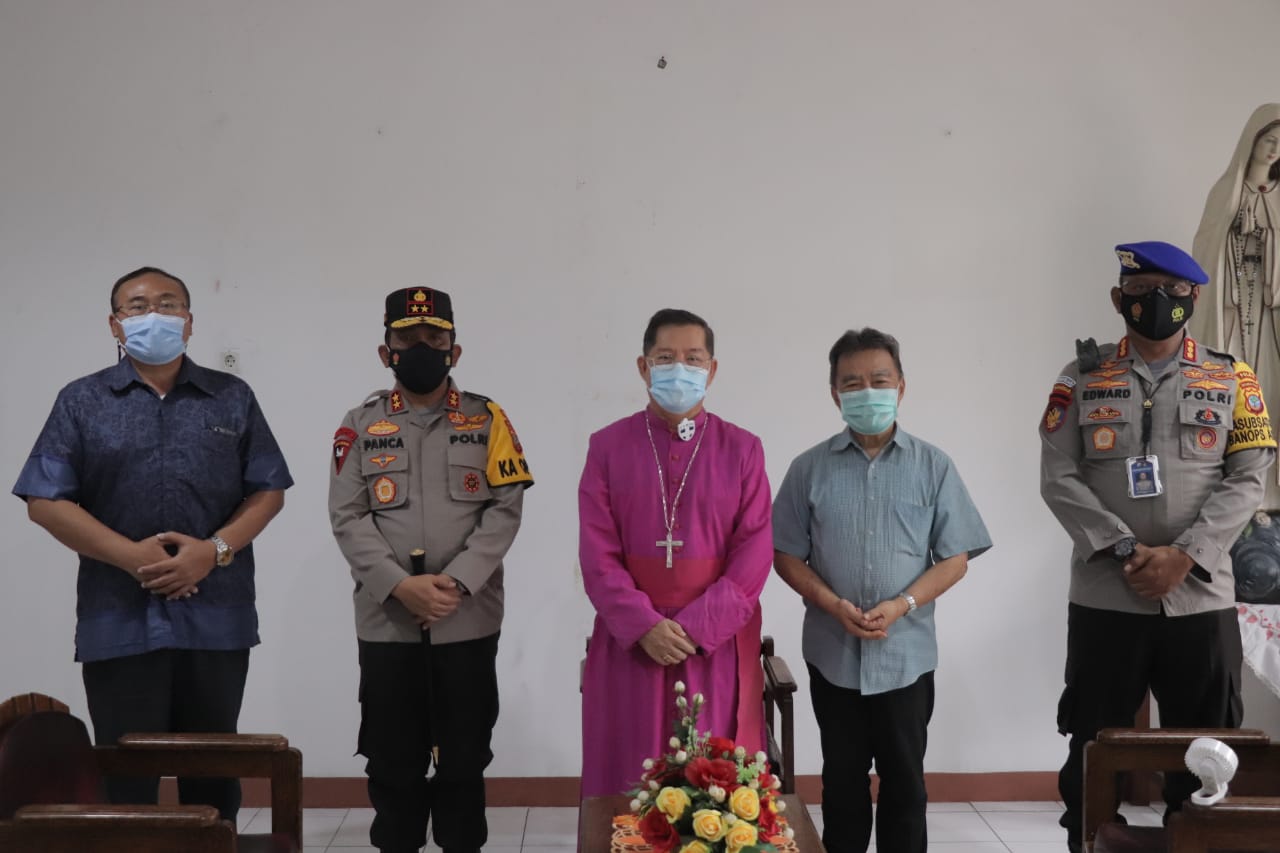 “Kami mengajak Uskup dan seluruh umat, mari bersama-sama kita mendukung program pemerintah dalam hal pencegahan penyebaran Covid-19, mengingat semakin bertambahnya jumlah kasus terkonfirmasi positif Covid-19 di wilayah Sulut khususnya Manado,” ujar Irjen Pol R.Z. Panca Putra.