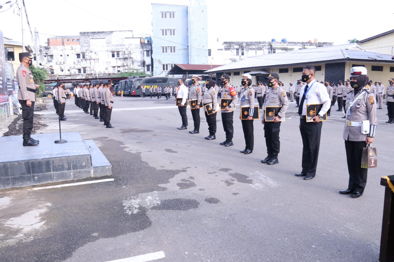 NASIONALXPOS.CO.ID, PALEMBANG – Usai memimpin apel pagi, Kapolda Sumsel Irjen Pol Prof Dr Eko Indra Heri S MM, memberikan penghargaan kepada anggota yang berprestasi, di lapangan apel Mapolda Sumsel, Senin (1/2/2021).